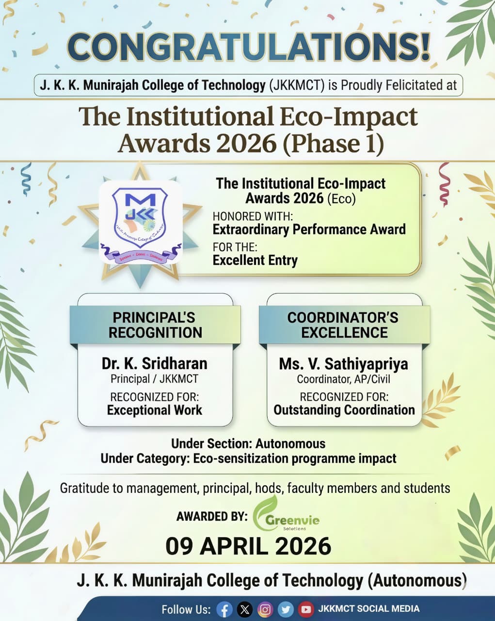 J.K.K. Munirajah College of Technology, Approved by AICTE, New Delhi and Affiliated to Anna University, Chennai, An Autonomous Institution & Accredited by NAAC 'A' Grade, is situated in Thookenaickenpalayam, Erode, covering 23.58 acres near Gobichettipalayam, approximately 19.4 kilometers from Sathyamangalam. We offer bachelor's and master's programs across various disciplines, aiming to provide opportunities for talented students from rural areas to pursue courses in technology.